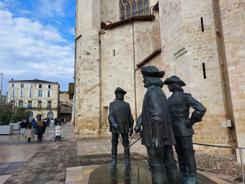 We krijgen een warme ontvangst in het Lycée Bossuet. De voltallige directie en het Erasmus+ team van het Lycée verwelkomen ons op school met een ontbijtje. Het weekprogramma wordt voorgesteld. We werken rond het thema “water”. De leerlingen leiden ons rond in hun school, een oud klooster met veel historiek. Het stadje Condom is misschien niet groot, maar wel rijk aan oude, authentieke gebouwen zoals de Gotische kathedraal. Een standbeeld van Les Trois Mousquetaires (die eigenlijk met vier waren) siert het centrale marktplein.